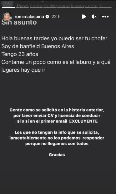 A lo que advirtió: "Gente, como se solicitó en la historia anterior, por favor enviar CV y licencia de conducir sí o sí en el primer mail. Excluyente. Los que no tengan la info que se solicita, lamentablemente no podemos responder porque no llegamos con todos", concluyó.