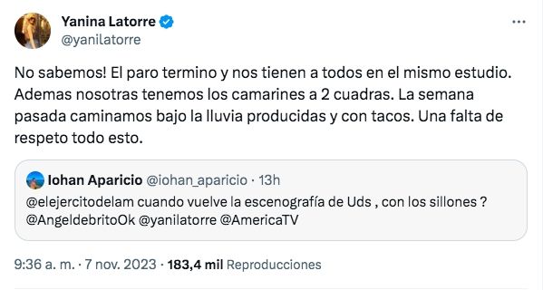 Todo comenzó cuando un seguidor le consultó a través de sus redes sociales sobre cuándo será el regreso de LAM a su estudio habitual. Allí, Latorre no dudó y no dudó en apuntar contra el canal por no haber podido resolver el conflicto que existe con los trabajadores desde el pasado 24 de octubre, cuando SATSAID (Sindicato Argentino de Televisión, Telecomunicaciones, Servicios Audiovisuales, Interactivos y de Datos) inició un paro el cual fue levantado la semana pasada.