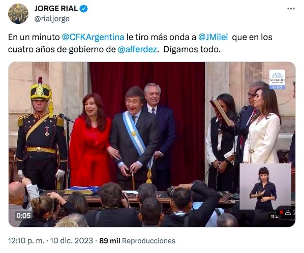 Tras las repercusiones mediáticas de las imágenes, Jorge Rial dio su opinión sobre lo que se pudo ver durante la transmisión en cadena nacional: "En un minuto @CFKArgentina le tiró más onda a @JMilei que en los cuatro años de gobierno de @alferdez. Digamos todo", disparó sin vueltas.