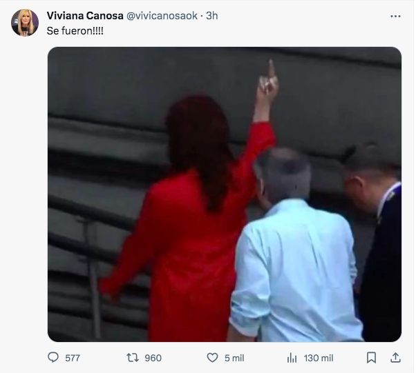 Fue Viviana Canosa quien se volcó a su cuenta de Twitter y expresó: "Se fueron!!!!", adjuntando una captura de pantalla de la transmisión televisiva donde se la puede ver a la ex vicepresidenta hacer el polémico gesto.
