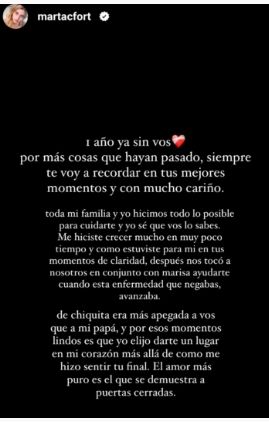 En tanto, en el pasado febrero, la heredera de Ricardo Fort posteó un mensaje muy profundo para su tutor y escribió: “Un año ya sin vos. Por más cosas que hayan pasado, siempre te voy a recordar en tus mejores momentos y con mucho cariño. Toda mi familia y yo hicimos todo lo posible para cuidarte y yo sé que vos lo sabés”.