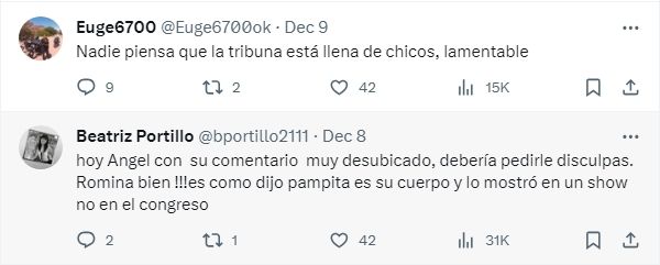 "Nadie piensa que la tribuna está llena de chicos, lamentable" y "Hoy Ángel con su comentario muy desubicado, debería pedirle disculpas. Romina bien !!!es como dijo pampita es su cuerpo y lo mostró en un show no en el congreso", fueron otros mesajes que pudieron verse en las redes.