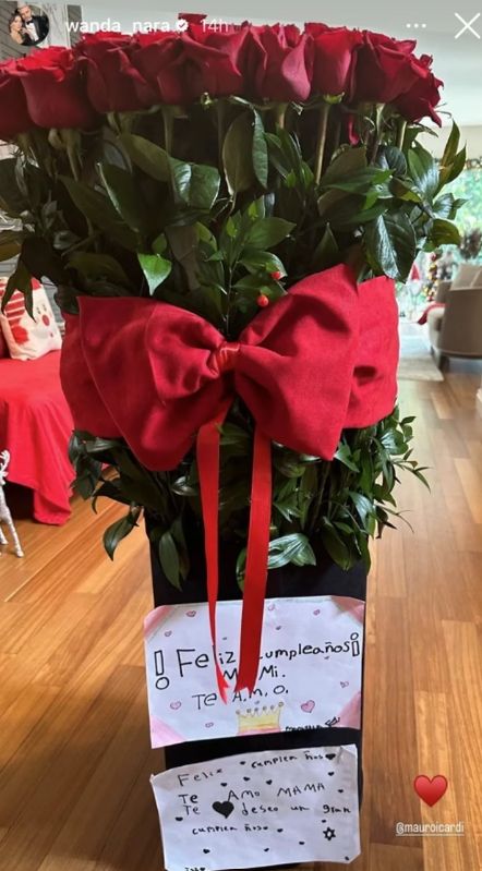 Porque lo primero que vio Wanda Nara al despertar fue un inmenso ramo de rosas rojas primorosamente presentadas con un moño del mismo color acompañadas por una tarjeta escrita de puño y letra de sus niñas.