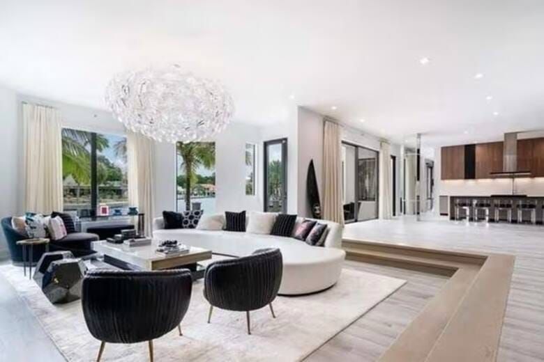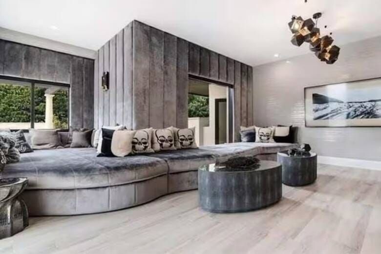 Por dentro la mansión también cuenta con ambientes a la altura del precio, que incluye una moderna cocina de estilo italiano,y otras comodidades como el living con un sillón semicircular, un televisor gigante y terminaciones en mármol respetando el estilo contemporáneo.