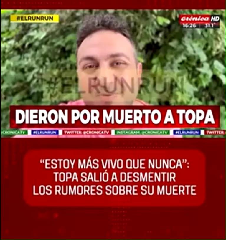 Topa mandó un video a Lío Pecoraro y Fernando Piaggio, del programa “El Run Run del Espectáculo”, ciclo emitido por Crónica y expresó su enojo: “Estoy más vivo que nunca. No puedo creer que es la tercera vez que me pasa esto”.