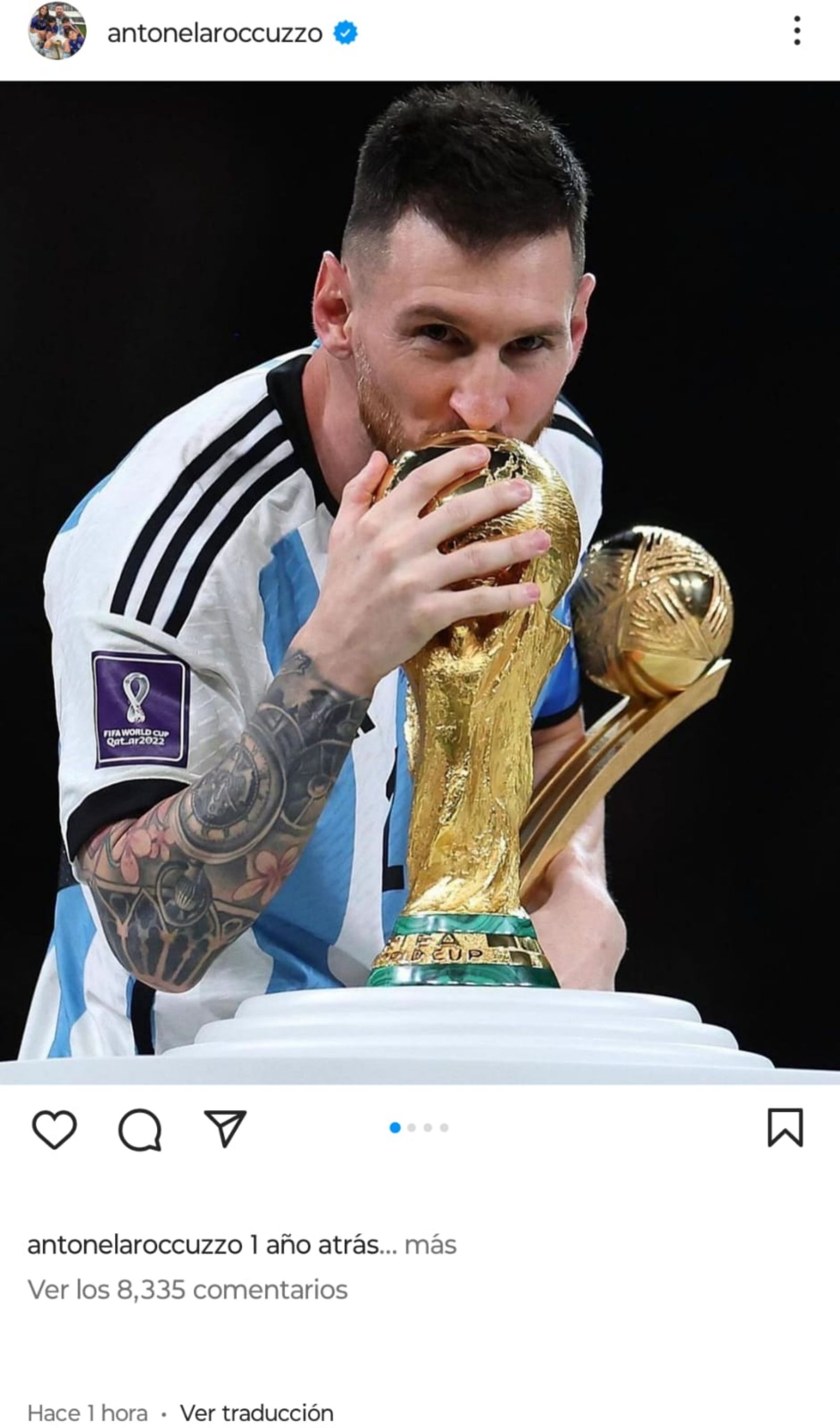 "1 año atrás. Feliz 18/12 argentinos/as", escribió la pareja de Lionel Messi en la publicación. En ella, compartió imágenes de aquel día: de Messi besando el trofeo; junto a su familia y más.