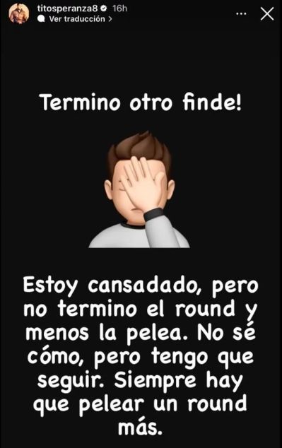 “¡Terminó otro finde! Estoy cansado, pero no terminó el round y menos la pelea. No sé cómo, pero tengo que seguir. Siempre hay que pelear un round más”, se descargó Tito a través de su cuenta de Instagram, junto a un emoji de un hombre tapándose la cara.