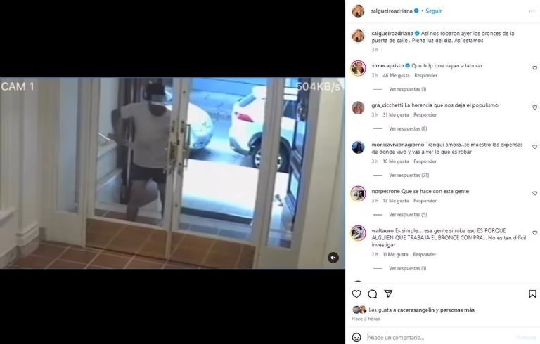 Lo preocupante de todo esto, además del hecho en sí, es que el robo tiene lugar a plena luz del día. “Así nos robaron ayer los bronces de la puerta de calle. Plena luz del día. Así estamos”, escribió Adriana Salgueiro en su Instagram.