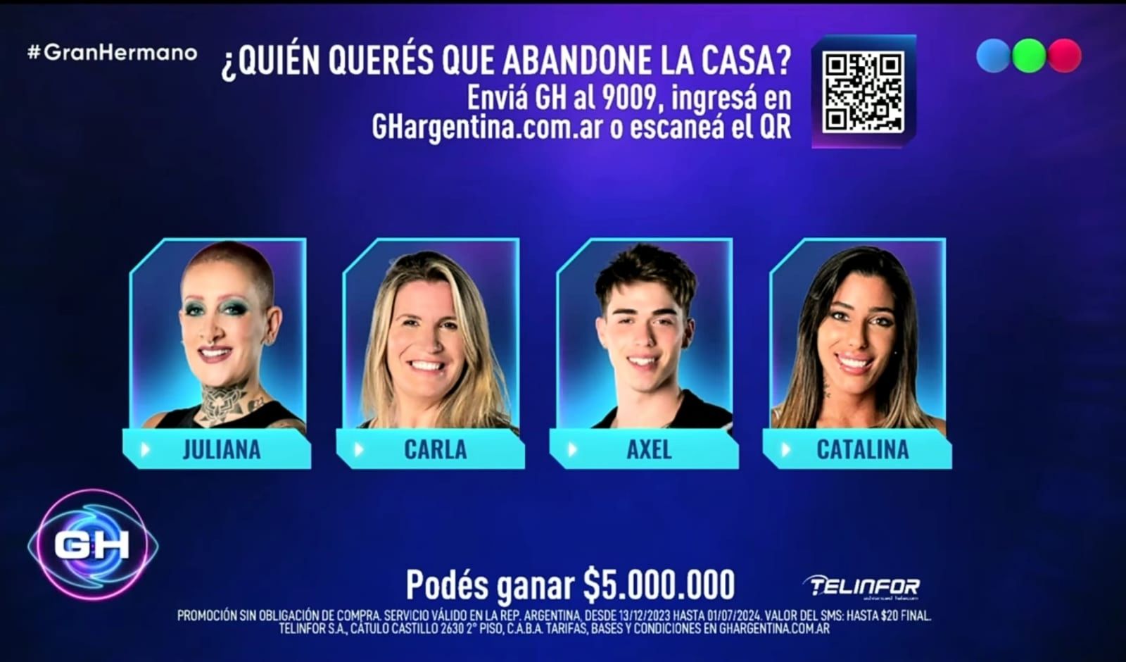 De esta forma, los nominados de esta semana son: Juliana con 10 votos; Carla con 9; Axel con 8; y Catalina con 7. Así, Sabrina Cortez se salvó de la placa y en su lugar entró Catalina, ya que se quitaron los votos de quienes conspiraron contra ella.