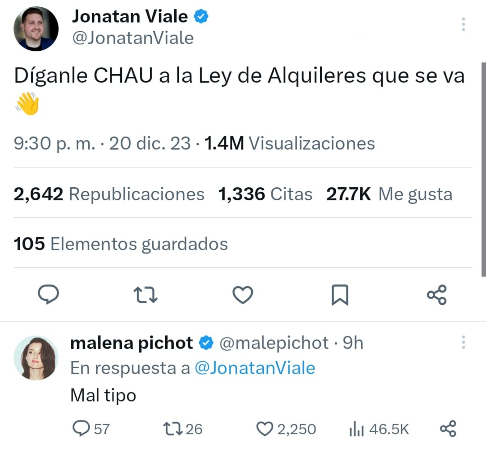 Uno de los comentarios que mayor polémica tuvo fue el de Jonatan Viale: "Díganle CHAU" a la Ley de Alquileres que se va". Esto despertó la reacción de varios usuarios quienes lo trataron de "mal tipo" y lo insultaron de diferentes formas.