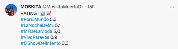 Por el lado de su competencia, La Noche de Mirtha (El Trece) tuvo que conformarse con 5.1 puntos, teniendo como invitados a Guillermo Francella, Soledad Silveyra, Juan José Campanella y Mariano Cohn.