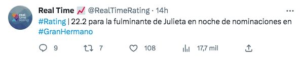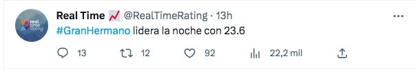 A las 23.03, el ciclo conducido por Santiago del Moro subía a 23,6 puntos, mientras que Amor de madre (eltrece) alcanzaba los 3,8 puntos. Al cierre, Gran Hermano tuvo su pico con 24,5 puntos.