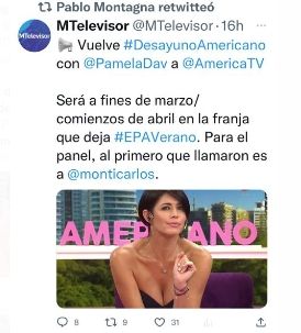 A pesar de sus confesiones respecto a la industria de la televisión, Pamela David aceptó el desafío de retornar a la pantalla chica, a su casa (América) y con un formato archi conocido para ella. Otra vez, la modelo se parará al frente del mítico Desayuno Americano.