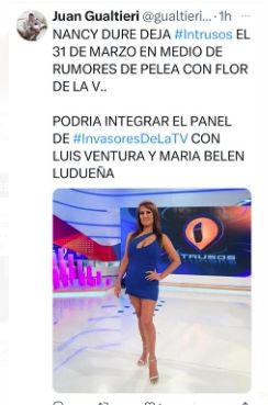 Ahora, otro comunicador, Juan Gualtieri, agregó más precisiones, sobre el día definitivo en que la morocha abandonará la mesa del ciclo de De la V: “Nancy Duré deja Intrusos el 31 de marzo en medio de rumores de pelea con Flor de la V”. Y también aportó claridad de su futuro: “Podría integrar el panel de Invasores de la tv con Luis Ventura”.