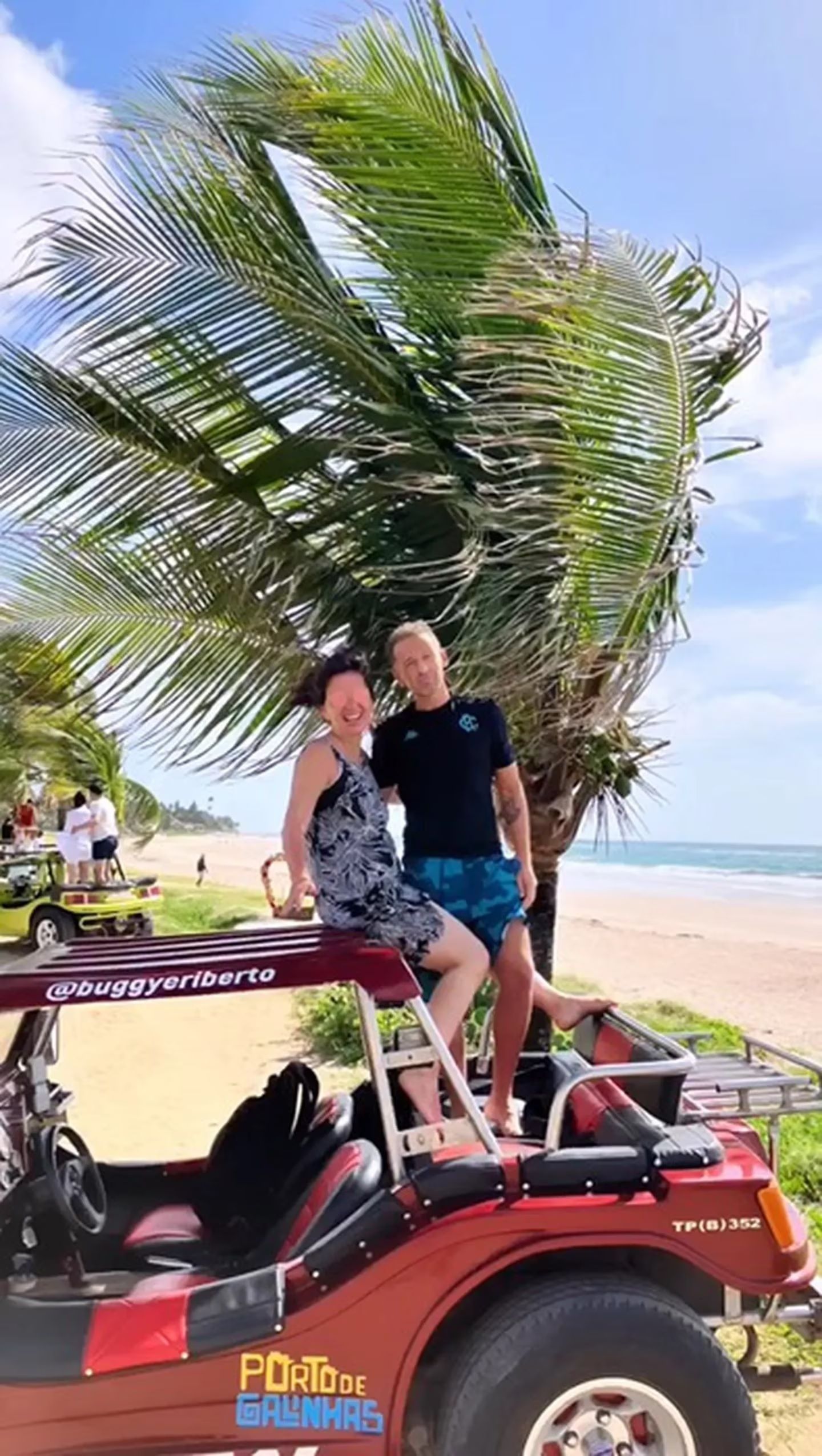En la foto que subió Edith dentro de su reel, se los puede observar posando sonrientes sobre un jeep, con una palmera de fondo y a tan sólo unos pocos metros del mar.