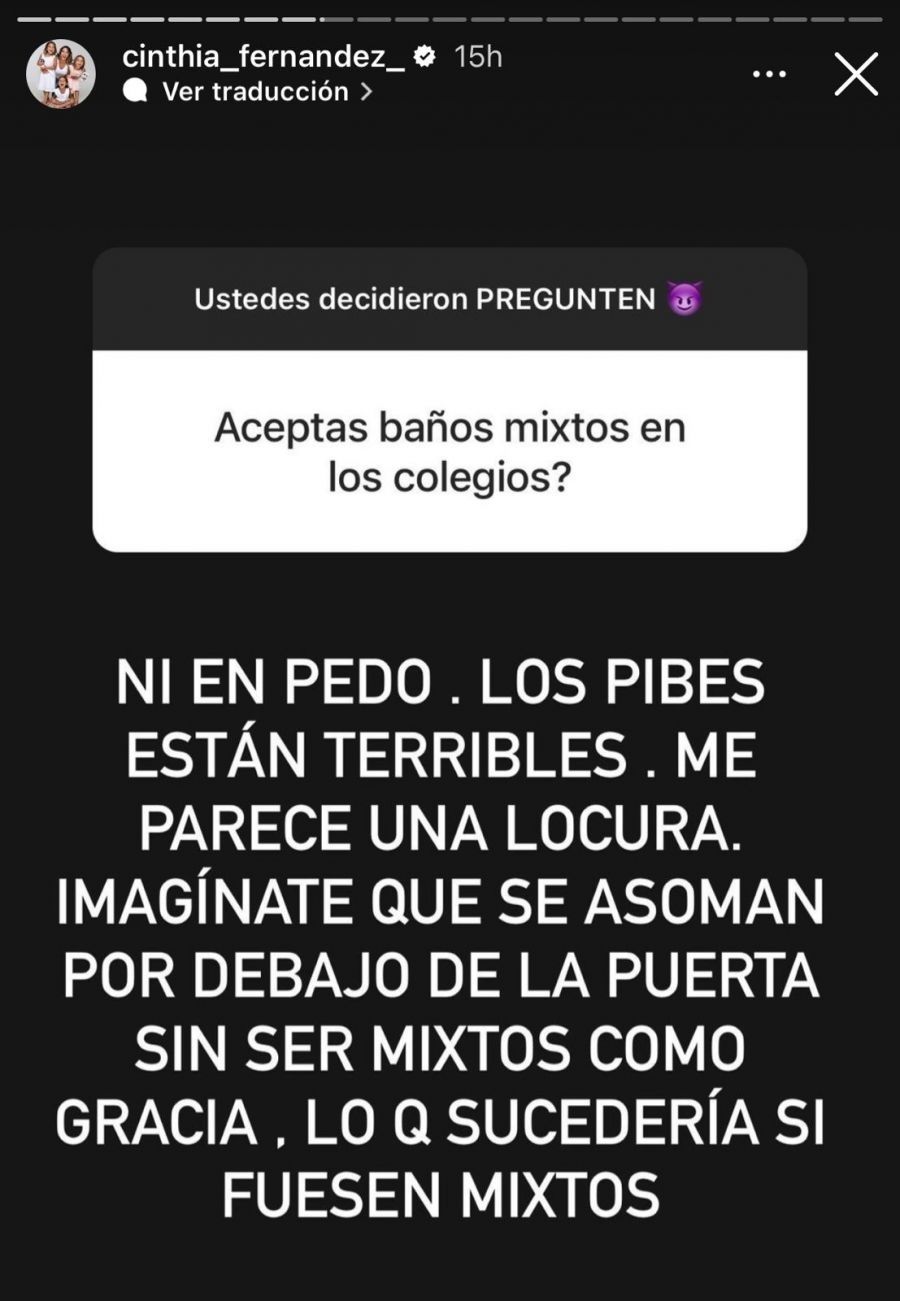 Desde hace algunos días se desató una verdadera polémica y debate por la implementación de los baños mixtos en las escuelas, tema que fue muy comentado en redes sociales. Ahora, quien salió a dar su visión al respecto fue Cinthia Fernández, que se mostró contundente al dar su parecer.