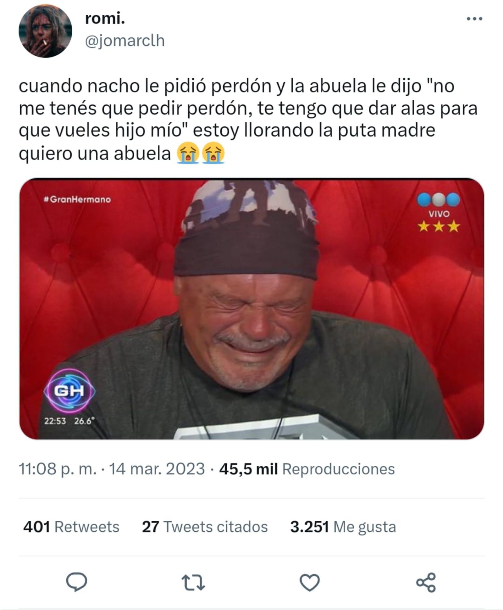 Nacho, mientras lloraba, se lamentó y le pidió disculpas a su abuela por haberla dejado sola, ya que ellos viven juntos: "Te extraño un montón, perdón por no haberte avisado a tiempo". Sin embargo, su abuela le hizo entender que estaba todo bien: "Al principio fue difícil, pero después pude entenderlo, tengo que darte alas para volar".