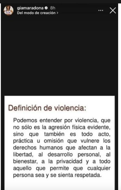 En la publicación de Maradona se lee: "Podemos entender por violencia, que no sólo es la agresión física evidente, sino que también es todo acto, práctica u omisión que vulnere los derechos humanos que afectan a la libertad, al desarrollo personal, al bienestar, a la privacidad”.