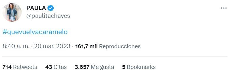 Paula, que luego de años de trabajar en Telefe pronto tomará nuevos rumbos con un proyecto propio, no tuvo drama en hacerse eco de la campaña que arrancó en Twitter y aportó con lo suyo con un mensaje tan sintético como enfático contra Gran Hermano: “Que vuelva Caramelo”.