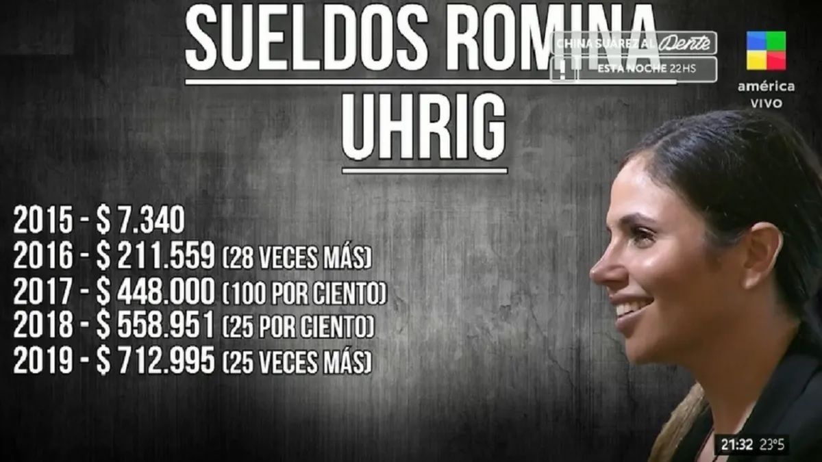 En LAM revelaron los sueldos que tenía Romina desde que se sumó a la función pública. En 2015 su ingreso fue de $7.340; en 2016 pasó a $211.559, en definitiva, 28 veces más; para 2017 pasó a $448.000 (100% más que el anterior); en 2018 subió un 25% al recibir $558.951; y finalmente en 2019 fue de $712.995, o sea, 25 veces más.
