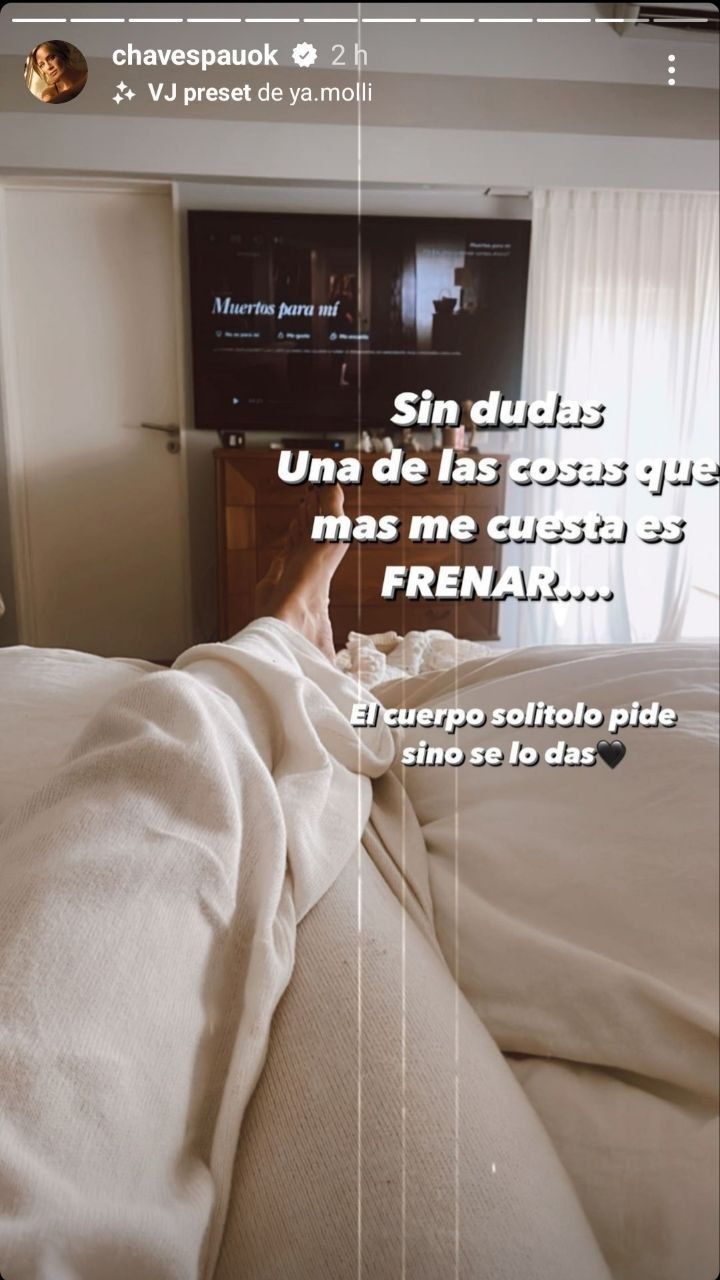 En la primera de ellas, en donde se la ve en cama mientras mira una película en la televisión, escribió: “Sin dudas, una de las cosas que más me cuesta es frenar. El cuerpo solito lo pide si no se lo das”. La preocupación de sus seguidores no se hizo esperar y, ante las consultas sobre su estado de salud, Paula compartió una aclaración inmediatamente.