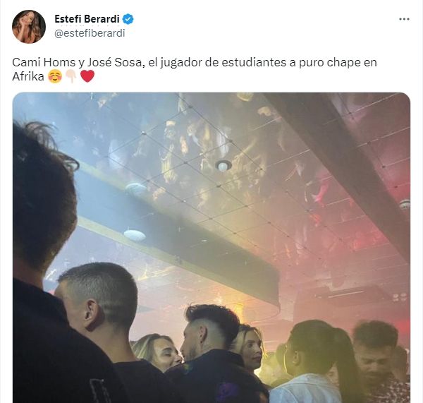 "Estuvieron toda la noche a los besos. Ella es soltera, es una diosa y la debe estar pasando bien”, cerró Berardi a modo de incógnita. Luego, en sus redes sociales confirmó que la persona que la acompañaba era el jugador José Sosa.