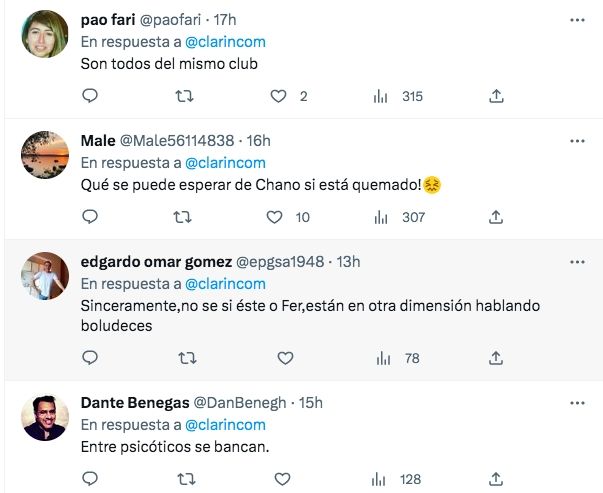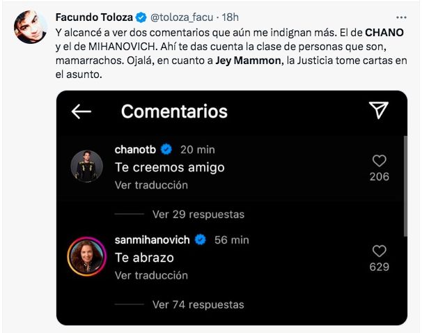 Sin embargo, Chano Moreno Charpentier le dejó un mensaje de apoyo y lo sepultaron en las redes. "Te creo. Te creemos amigo", escribió el líder de Tan Biónica. Tras las críticas recibidas, el músico decidió eliminar el mensaje.
