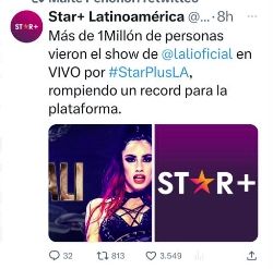 “Más de un millón de personas vieron el show de Lali en vivo por Star+, rompiendo un récord para la plataforma”, posteó la cuenta oficial. De este modo se ratificó que Espósito batió varias marcas, con el corte de entradas y también con las vistas de la transmisión.