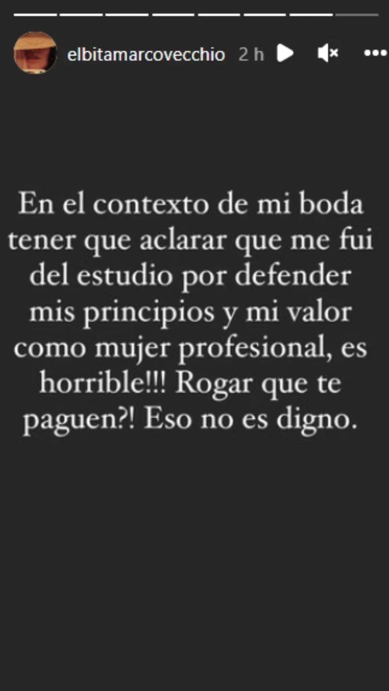 Allí se habló de que había una mala relación entre ambos, después de haber trabajado juntos en el mismo estudio (él era jefe de ella). Ante los rumores, Marcovecchio salió a aclarar los tantos con una picante historia: "En el contexto de mi boda tener que aclarar que me fui del estudio por defender mis principios y mi valor como mujer profesional, ¡es horrible! ¿Rogar que te paguen? Eso no es digno", disparó.