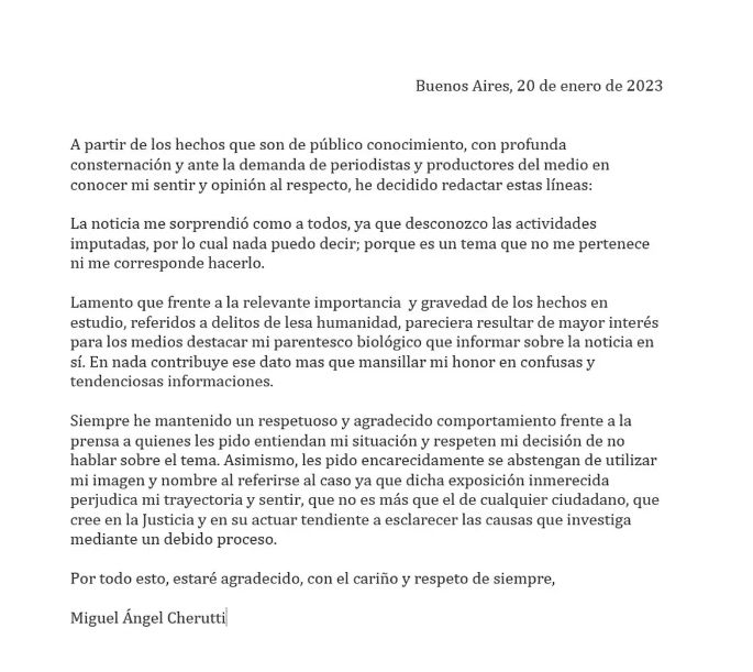 "Siempre he mantenido un respetuoso y agradecido comportamiento frente a la prensa a quienes les pido entiendan mi situación y respeten mi decisión de no hablar sobre el tema. Asimismo, les pido encarecidamente se abstengan de utilizar mi imagen y nombre al referirse al caso ya que dicha exposición inmerecida perjudica mi trayectoria y sentir, que no es más que el de cualquier ciudadano, que cree en la Justicia y en su actuar tendiente a esclarecer las causas que investiga mediante un debido proceso. Por todo esto, estaré agradecido, con el cariño y respeto de siempre. Miguel Ángel Cherutti", concluye.