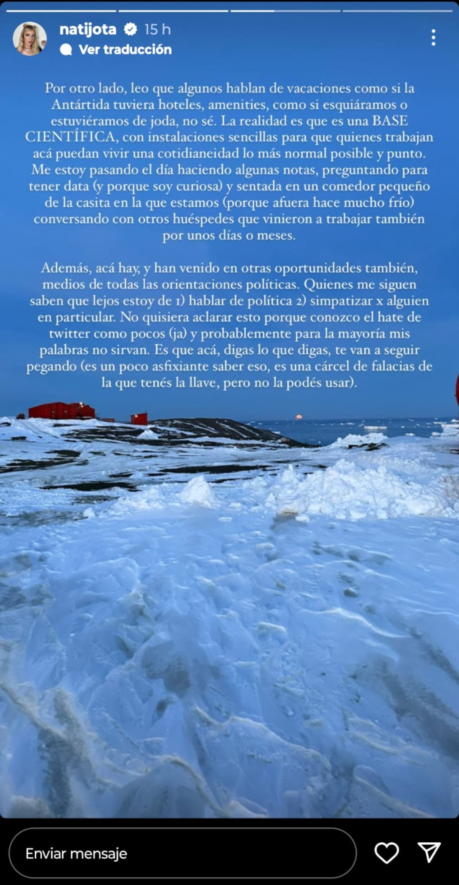 Por las críticas, la influencer dejó en claro su travesía por el sur, por medio de sus historias en Instagram: "Para sacar algunas dudas, porque leo información falsa replicándose y de manera sañosa. Estoy formando parte de un proyecto de divulgación sobre la Antártida Argentina, proyecto que pertenece a una productora que realiza contenidos educativos para jóvenes. No me trajo ningún medio particular".