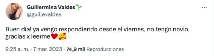 Tras las repercusiones de la noticia, la empresaria decidió romper el silencio y compartió su opinión al respecto en su cuenta oficial de Twitter. "¡Buen día! ya vengo respondiendo desde el viernes, no tengo novio, gracias por leerme".