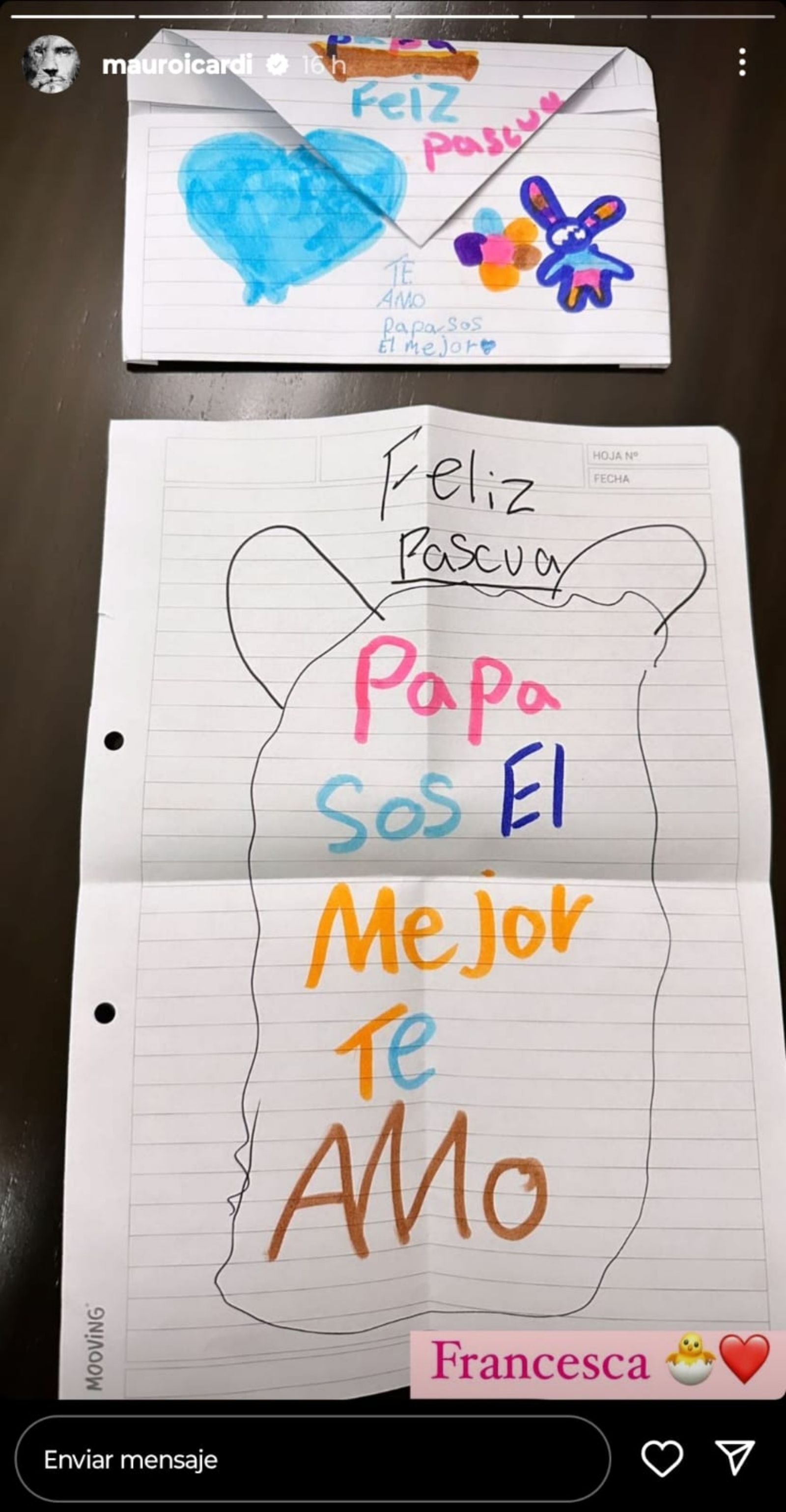 "Feliz Pascua. Papá sos el mejor. Te amo" fue la dedicatoria de Francesca Icardi a Mauro. La más chiquita de la familia también le dedicó unas amorosas palabras al futbolista: "Te amo, papá. Feliz Pascua".