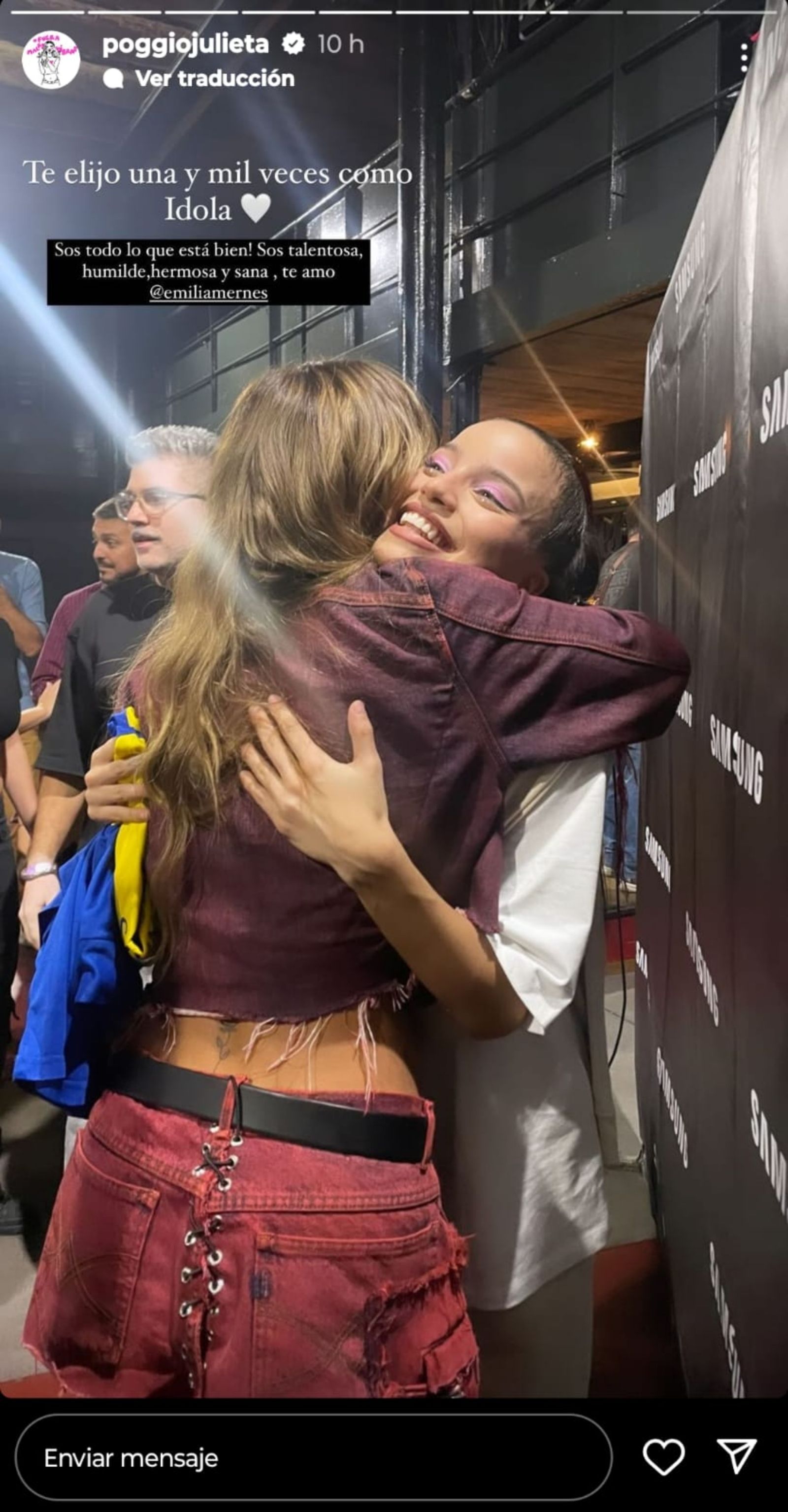 "Te elijo una y mil veces como ídola. ¡Sos todo lo que está bien! Sos talentosa, humilde, hermosa y sana. Te amo @emiliamernes" fue el mensaje que acompañó la foto que subió Julieta Poggio a sus historias.