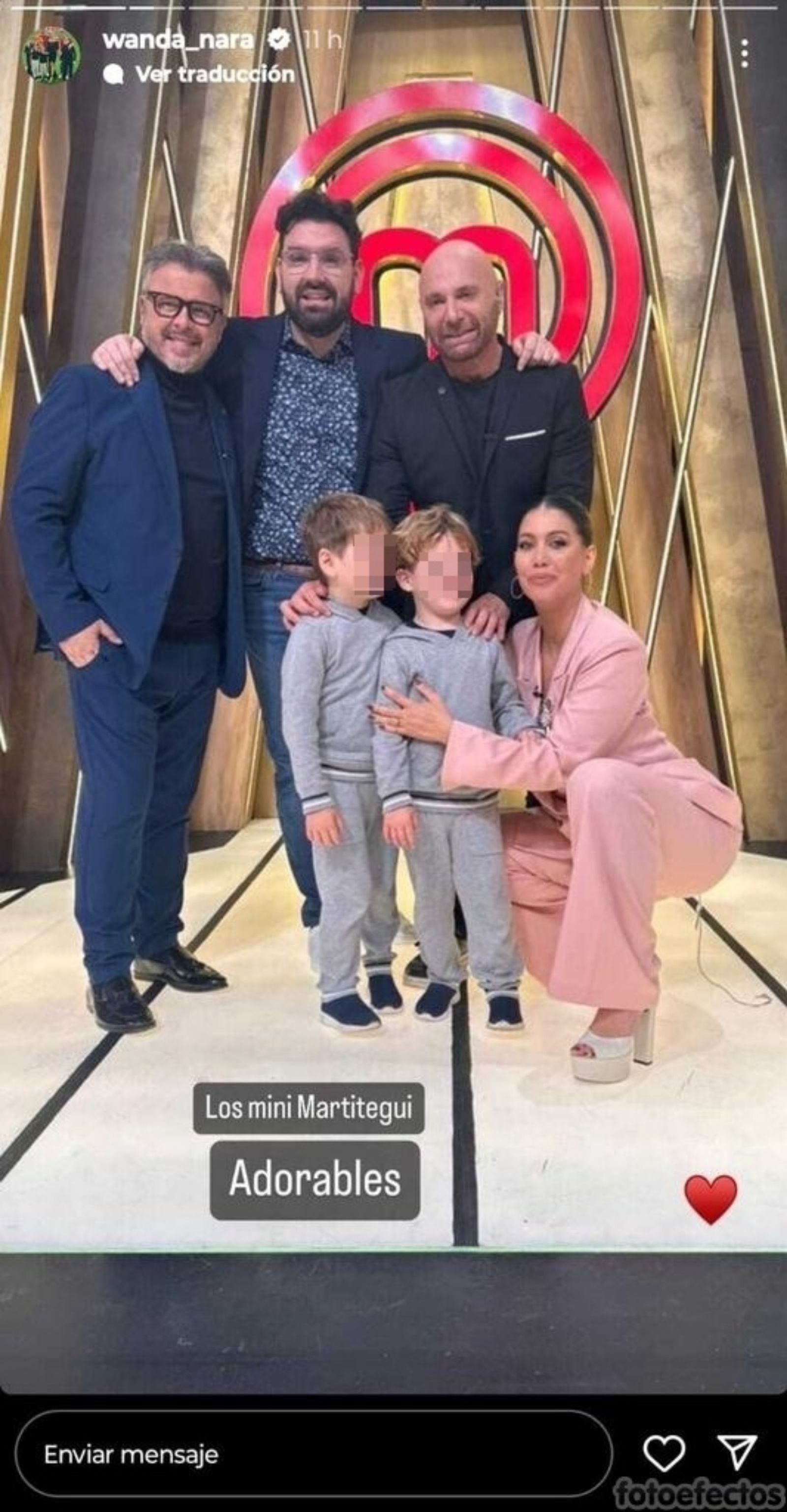 Este miércoles, la empresaria subió una foto a sus historias de Instagram junto a los hijos de Germán Martitegui, reconocido chef que forma parte del jurado de MasterChef Argentina 2023 junto a Damián Betular y Donato de Santis."Los mini Martitegui. Adorables" fue la frase que utilizó Wanda Nara para presentar a Lorenzo (3) y Lautaro (3).