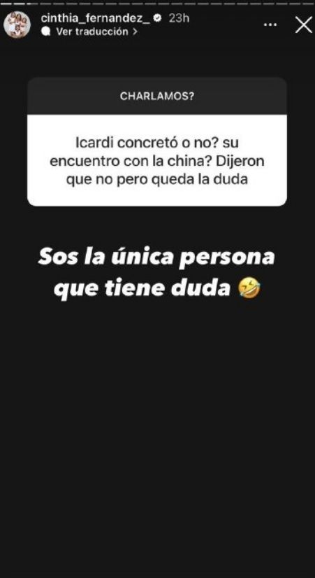 "¿Icardi concretó o no su encuentro con China? Dijeron que no, pero queda la duda", le preguntó un seguidor suyo, a lo que Cinthia Fernández sentenció con contundencia: "Sos la única persona que tiene la duda".