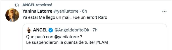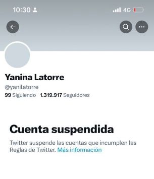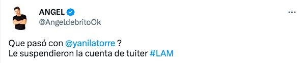 Fue Ángel de Brito quien reveló la noticia. "¿Qué pasó con @yanilatorre ? Le suspendieron la cuenta de twitter #LAM", escribió el conductor junto a una captura de pantalla que muestra al usuario suspendido por "incumplir las Reglas de Twitter".