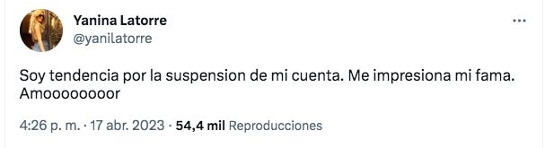 "Soy tendencia por la suspensión de mi cuenta. Me impresiona mi fama. Amoooooooor", remató Yanina.