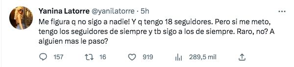 "Me figura que no sigo a nadie! Y que tengo 18 seguidores. Pero si me meto, tengo los seguidores de siempre y también sigo a los de siempre. Raro, ¿no? ¿A alguien mas le pasó?", consultó sorprendida por lo sucedido.
