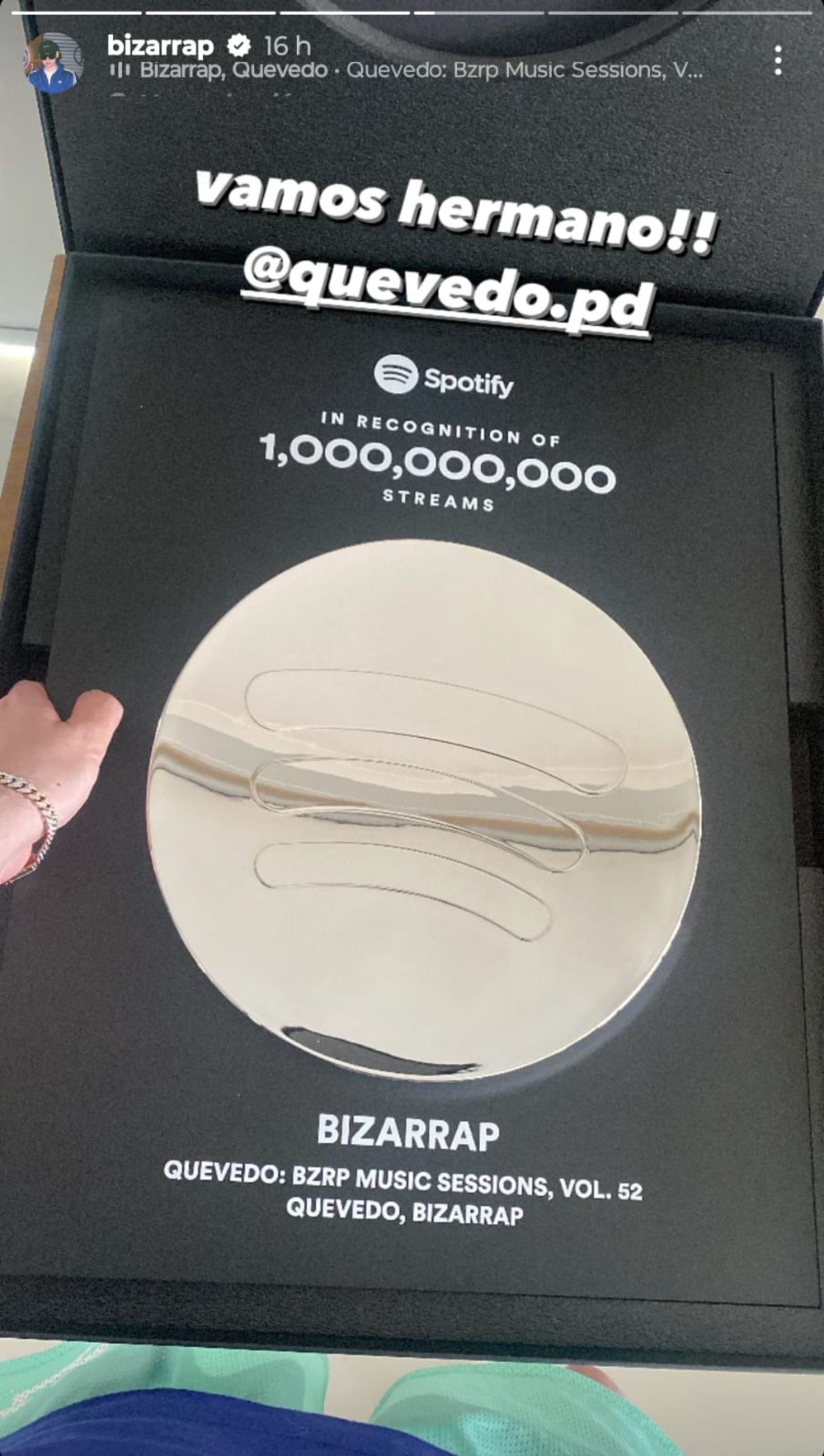 Este jueves, Bizarrap compartió en sus historias de Instagram (@Bizarrap) la feliz noticia de que se convirtió en el primer argentino en alcanzar los 1000 millones de reproducciones en Spotify, por el tema que sacó junto a Quevedo hace unos meses atrás.