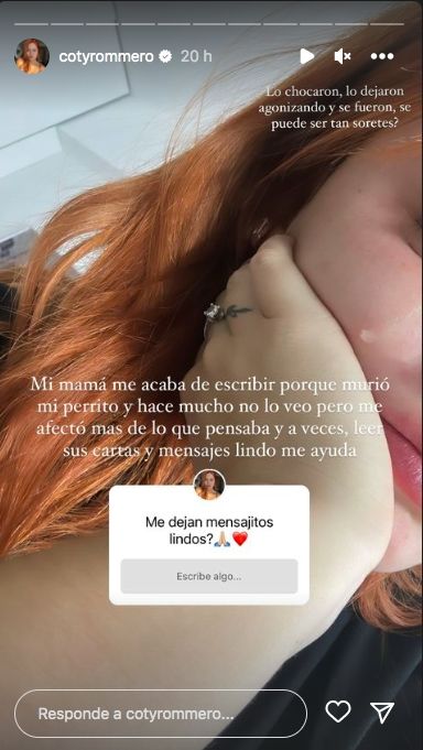 "Mi mamá me acaba de escribir porque murió mi perrito y hace mucho no lo veo pero me afectó más de lo que pensaba. Lo chocaron, lo dejaron agonizando y se fueron, ¿se puede ser tan soretes?", se preguntó a través de su cuenta oficial de Instagram.