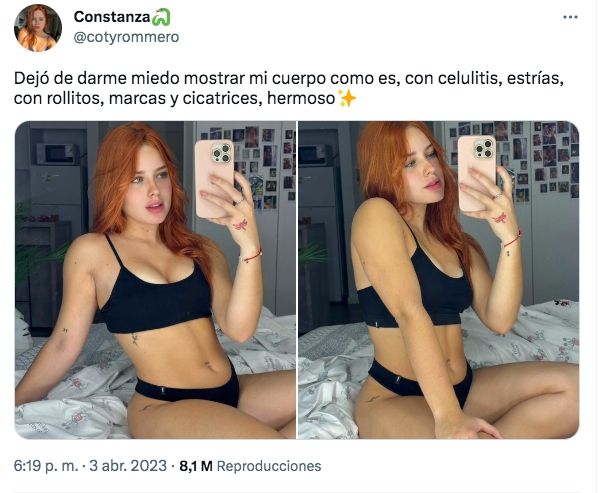 En ropa interior y sentada en su cama, la correntina expresó: "Dejó de darme miedo mostrar mi cuerpo como es, con celulitis, estrías, con rollitos, marcas y cicatrices, hermoso".