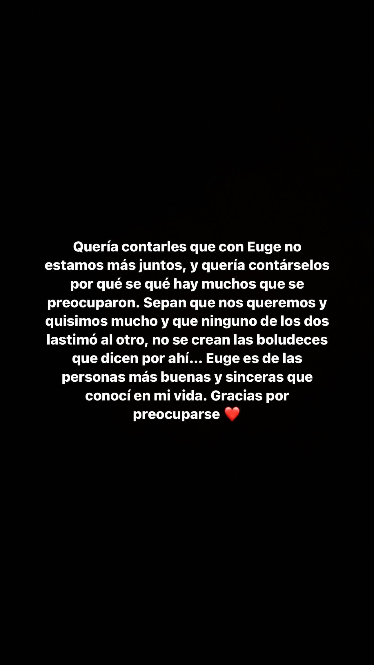 "Quería contarles que con Euge no estamos más juntos, y quería contárselos porque sé que hay muchos que se preocuparon. Sepan que nos queremos y quisimos mucho, y que ninguno de los dos lastimó al otro, no se crean boludeces que dicen por ahí", aclaró a modo de descargoi Rusherking.