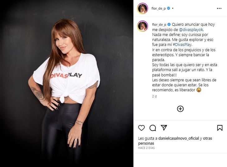 "Quiero anunciar que hoy me despido de Divas Play. Nada me define; soy curiosa por naturaleza. Me gusta explorar y eso fue para mí #DivasPlay. Ir en contra de los prejuicios y de los estereotipos. Y siempre bancar la parada", comenzó explicando Florencia Peña en su Instagram.