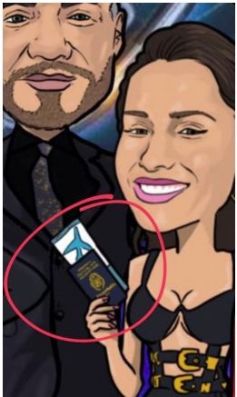 Se trata de una caricatura de los cuatro jurados, abrazados a Marcelo. Una linda creación artística, pero que posee un detalle no menor en Carolina Ardohain, dado que el personaje luce con un elemento singular en su mano, más precisamente un pasaporte.