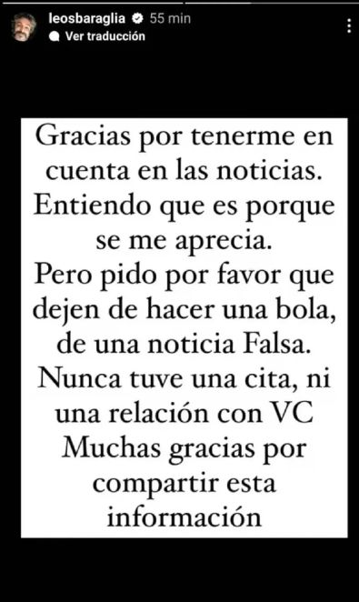 Fue este último quien decidió despegarse del rumor. En un posteo en sus historias en Instagram expresó: "Gracias por tenerme en cuenta en las noticias, entiendo que es porque se me aprecia. Pero pido, por favor, que dejen de hacer una bola de una noticia falsa. Nunca tuve una cita, ni una relación con VC. Muchas gracias por compartir esta información", compartió.