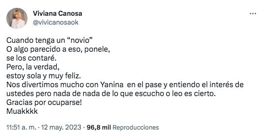 Por su parte, Canosa también se refirió a. los rumores de romance con el actor. "Cuando tenga un 'novio' o algo parecido, ponele, se los contaré. Pero, la verdad, estoy sola y muy feliz", comenzó expresando.
