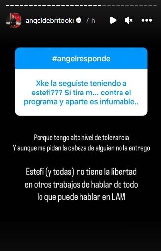 "¿Por qué la seguiste teniendo a Estefi? Si tira m... contra el programa y aparte es infumable", sugirió otro. "Porque tengo alto nivel de tolerancia y aunque me pidan la cabeza de alguien, no la entrego. Estefi (y todas) no tienen la libertad en otros trabajos de hablar de todo lo que puede hablar en LAM", aclaró para finalizar.
