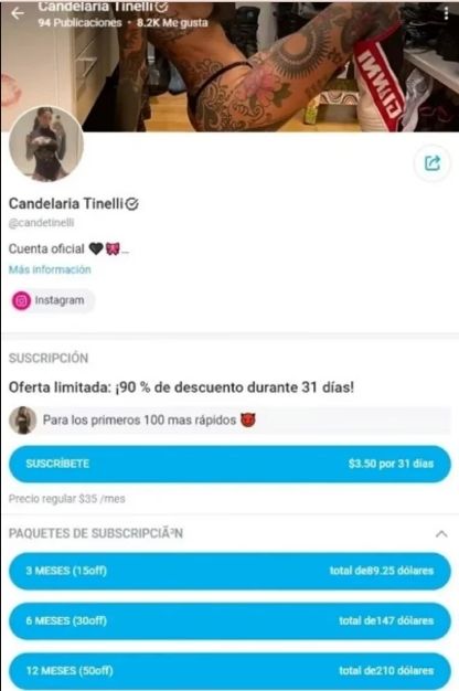 "Es un hecho, tengo OnlyFans", había anunciado en marzo pasado Cande desde sus redes sociales. "Soy cande, tengo 32 y me abrí Only para divertirme y conocer gente piola", escribió junto al emoji de un diablo. Allí, se ve que su cuenta está verificada. Tiene casi seis mil suscriptores.