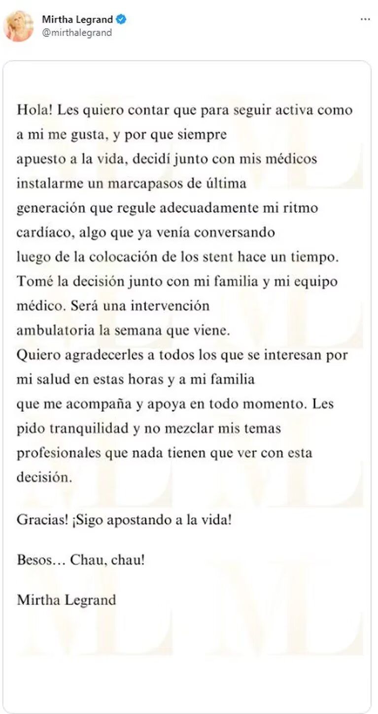 Cuando se conoció el miércoles pasado la noticia de la operación de la diva, fue la propia Legrand la encargada de dar algunos detalles sobre su salud desde su cuenta de Twitter. “Les quiero contar que para seguir activa como a mí me gusta, y porque siempre apuesto a la vida, decidí junto a mis médicos instalarme un marcapasos de última generación que regule adecuadamente mi ritmo cardíaco, algo que ya venía conversando luego de la colocación de los stent hace tiempo”, explicó.